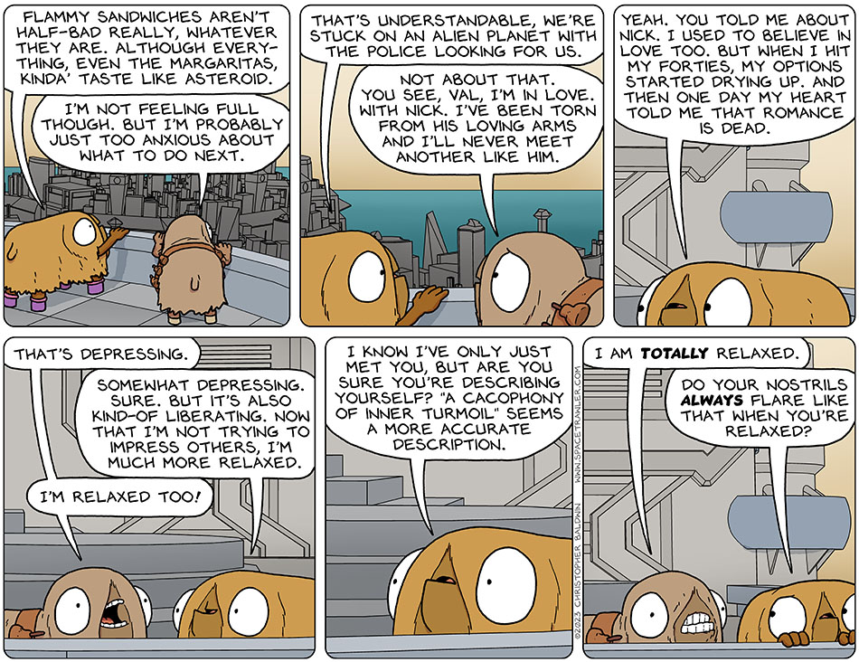 Val and Audri have relocated to a public balcony overlooking the city they are in. Looking out, Val said, “flammy sandwiches aren’t half-bad really, whatever they are. Although everything, even the margaritas, kinda’ taste like asteroid.” Audri said, “I’m not feeling full though. But I’m probably just too anxious about what to do next.” Val looked at her and said, “that’s understandable, we’re stuck on an alien planet with the police looking for us.” But Audri corrected her and said, “not about that. You see, Val, I’m in love. With nick. I’ve been torn from his loving arms and I’ll never meet another like him.” Val said, “yeah. You told me about Nick. I used to believe in love too. But when I hit my forties, my options started drying up. And then one day my heart told me that romance is dead.” Distressed by this, Audri said, “that’s depressing.” Val reassured her, “somewhat depressing. Sure. But it’s also kind-of liberating. Now that I’m not trying to impress others, I’m much more relaxed.” Eyes wide, Audri said, “I’m relaxed too!” Looking concerned, Val said, “I know I’ve only just met you, but are you sure you’re describing yourself? ‘A cacophony of inner turmoil’ seems a more accurate description.” Teeth gritted, Audri said, “I am totally relaxed.” Cautiously, Val asked, “do your nostrils always flare like that when you’re relaxed?”