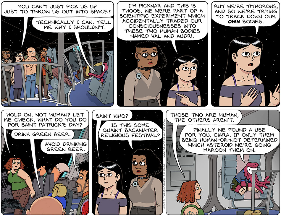Still on the bridge of the GOB Spacetrawler, Picknar said, "you can't just pick us up just to throw us out into space!" Krep replied, "technically I can. Tell me why I shouldn't." Picknar told him their story, "I'm Picknar and this is Thoos. we were part of a scientific experiment which accidentally traded our consciousnesses into these two human bodies named Val and Audri. But we're Tithorons, and so we're trying to track down our own bodies." Ciara, a red-headed human from Ireland who has been introduced in the third Spacetrawler series, stood up and said, "hold on. Not human? Let me check. What do you do for Saint Patrick's Day?" Knox said, "drink green beer." Rodrigo said, "avoid drinking green beer." Picknar said, "saint who?" Thoos said, "is this some quaint backwater religious festival?" Ciara turned to Krep and said, "those two are human, the others aren't." Krep said, "finally we found a use for you, Ciara. If only them being human-or-not determined which asteroid we're going maroon them on."