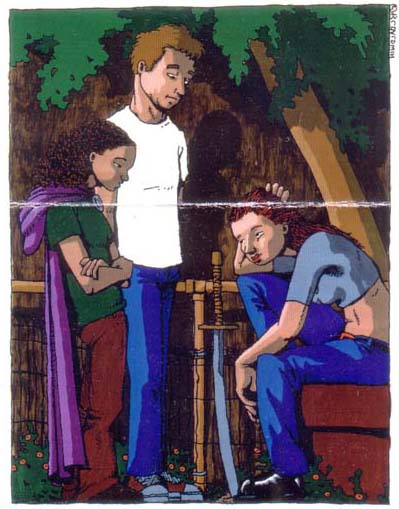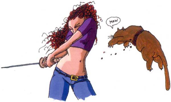 --- Destroying Limbo --- I've always hated the title. And much of the script i wrote (about 30 pages), suffered the same melodramtic tone. Unfortunately, taking myself seriously didn't sound good until around 1997. The plot revolves around a mystical sword which holds enormous power indescriminately to whomever possesses it. As a result, the "forces of evil" are always trying to obtain it. The sword begins in the hands of Jason, who left his true love, Jasmine, in order to keep evil things from her. Oh, and he travels with his short sharp-tounged sidekick a young enchantress (I've forgotten her name). He is finally returning to Jasmine, when he happnes to get impaled. She finds him, dying, and the sword is passed on to her. Basically the story is her getting pursued by evil, until finally she "destroys limbo" and turns around to face it, and becomes the pursuer. Most of the art so far was only okay, a few gem shots. I like the pacing on page 2. Oh right, and evil often possessed kitty-cats, which she would have to reluctantly (although desperately) fight off. |