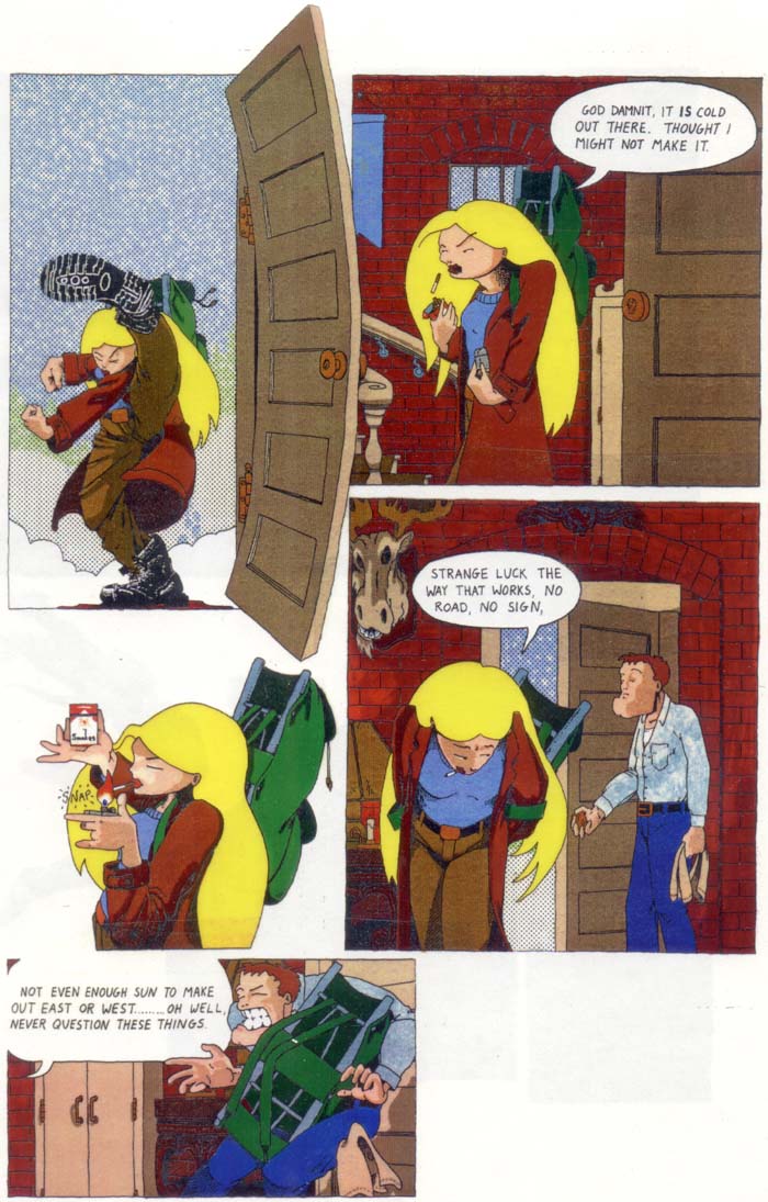--- Ladornia the Lumbermaid --- I created Ladornia probably sometime around 1992. Trail Potter ("Salty") and I attempted a second collaboration, but here's how it worked. He wrote a script (a perfectly good one) (which if i can find at a later date, i will post), but it didn't fit my vision. A couple years later, I unearthed the manuscript and realized I liked it, and since my original vision wasn't as strong, it seemd like a fun thing to do. Unfortunately I only made it most of the way through page one. The flow of her movements, and the character of the details is nice. The guy suffers from the "cancerously large chin syndrome" (c.l.c.s.), and not in a particularly attractive way. But she's a bit of a troll too, which is part of what makes her so cool. Anyhow.... |