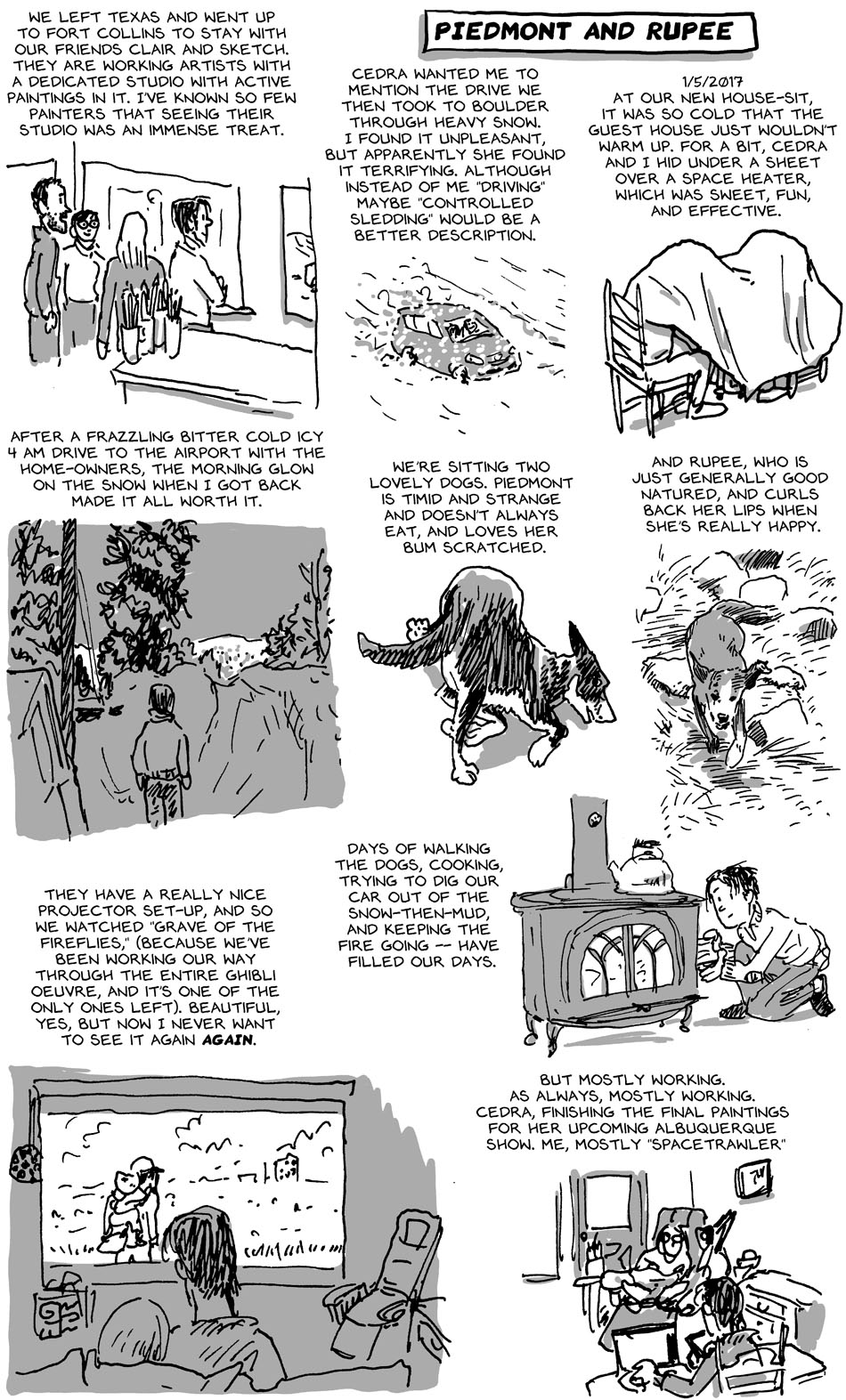 6. Thanks for your wonderful art, storytelling, and sharing of your adventures! I am also envious to a certain extent of your road-trip wanderings around the country, and while my life is way too complicated with 4 kids to escape, I am curious how your schedule is arranged? Are you in some sort of network where these house/dog sitting opportunities are worked out? I have many friends sprinkled around the world, some due to my years of SF convention attendance and others due to my online business making small spaceship toys for gaming, but your connections are superb! Thanks again, and take care!