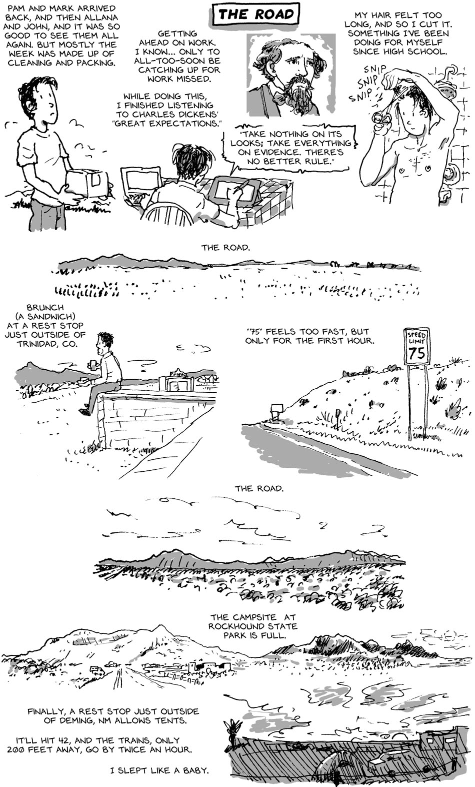 Part-way there. Resting briefly in Phoenix. But this strip covers the first day of travel. I drew the pictures in my tent by book-light and with references taken on my phone. Pieced it together in a library. True travel, that is. πŸ˜‰