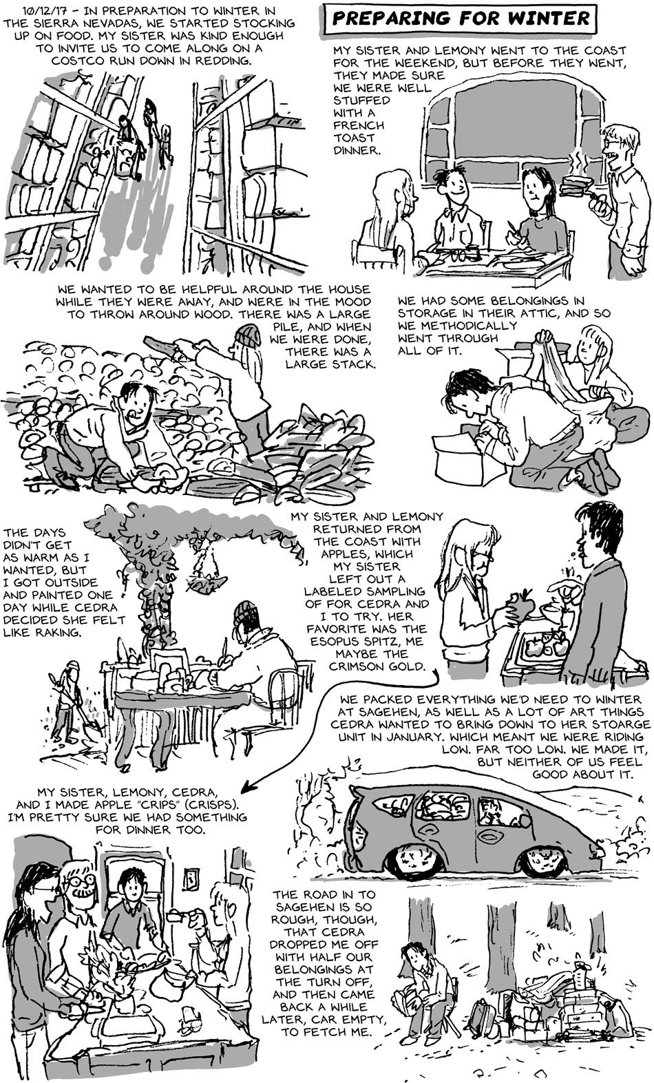 10/20/17 Diary: Preparing for Winter Previous | Next First Strip Original Series (Move to MA) | First Strip Second Series (Some with Cedra) First Strip Third Series (Living on the road with Cedra | First Strip Third Series (St Eustatious/Statia) First Strip Current Series (South America) | Archive | Most Recent Previous | Next First Strip Original Series (Move to MA) | First Strip Second Series (Some with Cedra) First Strip Third Series (Living on the road with Cedra | First Strip Third Series (St Eustatious/Statia) First Strip Current Series (South America) | Archive | Most Recent Sorry, ran a little late. For once, all the drawings were already done, I just lost track of which day it is. First Strip Original Series | First Strip Second Series | First Strip Third Series | First Strip Current Series | Archive | Most Recent 10/13/17 Diary: Las Vegas 10/27/17 Diary: Art + Environment Conference 3 Comments Felixscout October 20, 2017 at 1:24 pm 8 years ago Yeah I’ve done that to a car before but our choice was to dump about 50lbs of possessions in a dumpster next to a gas station in Nebraska just off I-80. We didn’t hold on to it because we had to make Los Angeles by the end of the next day. Oy… Christopher Baldwin October 20, 2017 at 2:11 pm 8 years ago Oh no! Ugh. What a nightmare that must have been. Sounds like we got off easy! SARA DAVIS October 21, 2017 at 9:23 am 8 years ago You must have been a sight, sitting at the side of the road with a random bunch of stuff. π I hope you are snugly ensconced for the winter now. Leave a Reply Cancel reply Your email address will not be published. Required fields are marked *CommentName* Email* Website Notify me of follow-up comments by email. Notify me of new posts by email.