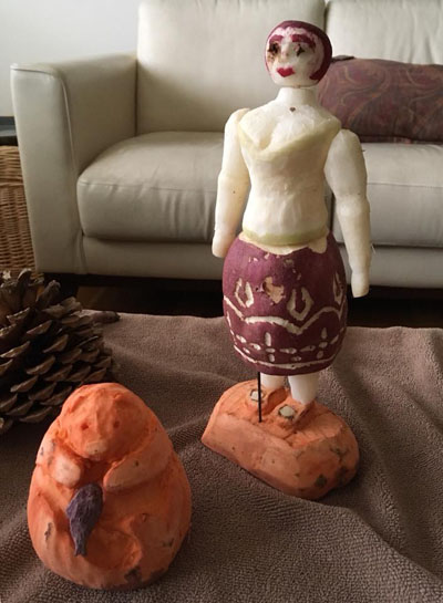1. Thanks for posting the photo of the sculptures. From the drawing, I thought yours was carved from one long root, but I see that you assembled it from multiple vegetables (nice use of the colors).