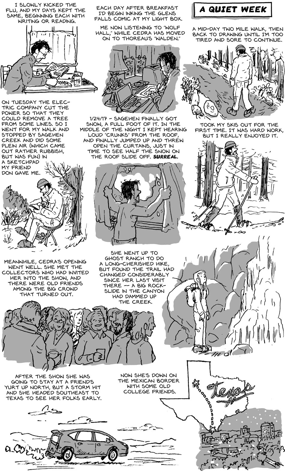 01/26/18 Diary: A Quiet Week Previous | Next First Strip Original Series (Move to MA) | First Strip Second Series (Some with Cedra) First Strip Third Series (Living on the road with Cedra | First Strip Third Series (St Eustatious/Statia) First Strip Current Series (South America) | Archive | Most Recent Previous | Next First Strip Original Series (Move to MA) | First Strip Second Series (Some with Cedra) First Strip Third Series (Living on the road with Cedra | First Strip Third Series (St Eustatious/Statia) First Strip Current Series (South America) | Archive | Most Recent I’m missing Cedra, but am plugging away at my work. But yay! Snow! I gots Skis! 🙂 First Strip Original Series | First Strip Second Series | First Strip Third Series | First Strip Current Series | Archive | Most Recent 01/19/18 Diary: Brief Path Diversion 02/02/18 Diary: Biding Limbo 2 Comments War Pig January 26, 2018 at 8:24 am 8 years ago Doing cross country on skis will make you sore in muscles you didn’t knew you had. Great aerobic exercise, though. Night-Gaunt49 January 26, 2018 at 6:13 pm 8 years ago All that walking and skiing will get you in shape, once you survive the sore muscles that is. Leave a Reply Cancel reply Your email address will not be published. Required fields are marked *CommentName* Email* Website Notify me of follow-up comments by email. Notify me of new posts by email.