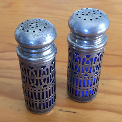 I love those salt and pepper shakers, too, and I recognize the design as late Arts and Crafts, shading off into Orientalist. Nearly a century old at this point, and I can’t imagine many survived the metal drives in World War II. Would that I knew more about the history of the use of blue glass in this period, which could pinpoint the actual date they were made.