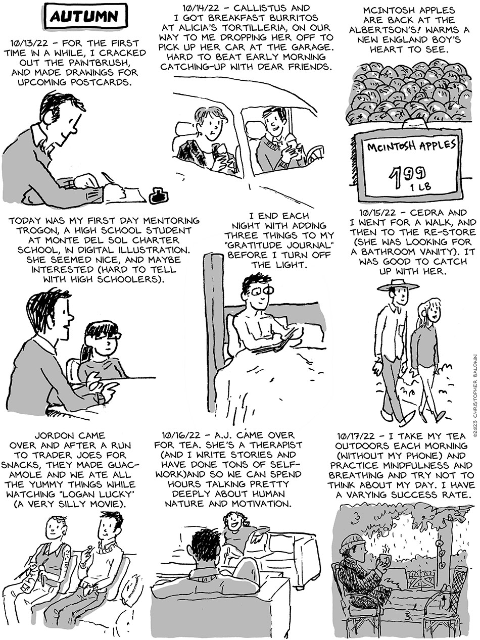 10/17/22 Diary: Autumn Previous | Next First Strip Original Series (Move to MA) | First Strip Second Series (Some with Cedra) First Strip Third Series (Living on the road with Cedra | First Strip Third Series (St Eustatious/Statia) First Strip Current Series (South America) | Archive | Most Recent Previous | Next First Strip Original Series (Move to MA) | First Strip Second Series (Some with Cedra) First Strip Third Series (Living on the road with Cedra | First Strip Third Series (St Eustatious/Statia) First Strip Current Series (South America) | Archive | Most Recent Trying to start-up the ol’ journal comic again. “Autumn.” First Strip Original Series | First Strip Second Series | First Strip Third Series | First Strip Current Series | Archive | Most Recent 06/22 – Dancing and Working 10/23/22 Diary: Cloud Cover 6 Comments Robert John Fletcher November 6, 2022 at 11:30 am 3 years ago Cool. Glad you’re doing this again. Janet Davis November 6, 2022 at 9:19 pm 3 years ago I like this. Flyswatter November 7, 2022 at 6:38 am 3 years ago Always loved these, and appreciate your sharing them with us Christopher. I may -embrace that last thought from 10-17. Christopher Baldwin November 7, 2022 at 10:39 am 3 years ago @Flyswatter, I live SO MUCH just up in my head, that I’ve been working hard to learn to experience being in my body more. I think it’s been a really healthy thing for me. π pitgamer November 7, 2022 at 9:12 am 3 years ago Sweet! Night-Gaunt November 8, 2022 at 1:19 am 3 years ago I always find these interesting on a human level. Thanx Leave a Reply to Flyswatter Cancel reply Your email address will not be published. Required fields are marked *CommentName* Email* Website Notify me of follow-up comments by email. Notify me of new posts by email.