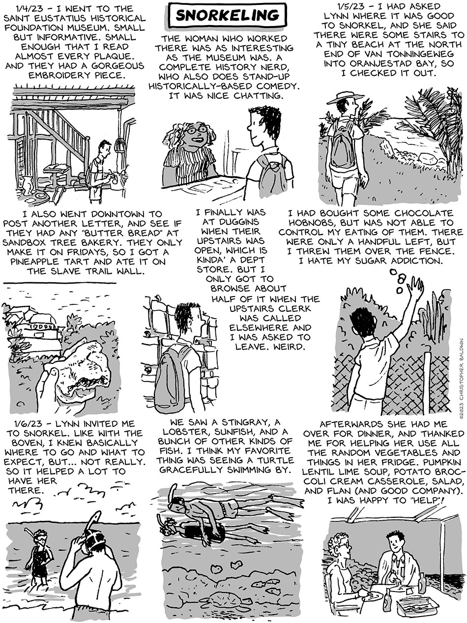 01/09/23 Diary: Snorkeling Previous | Next First Strip Original Series (Move to MA) | First Strip Second Series (Some with Cedra) First Strip Third Series (Living on the road with Cedra | First Strip Third Series (St Eustatious/Statia) First Strip Current Series (South America) | Archive | Most Recent Previous | Next First Strip Original Series (Move to MA) | First Strip Second Series (Some with Cedra) First Strip Third Series (Living on the road with Cedra | First Strip Third Series (St Eustatious/Statia) First Strip Current Series (South America) | Archive | Most Recent 01/05/23 Diary: The Boven 01/12/23 Diary: Venus Bay Leave a Reply Cancel reply Your email address will not be published. Required fields are marked *CommentName* Email* Website Notify me of follow-up comments by email. Notify me of new posts by email.