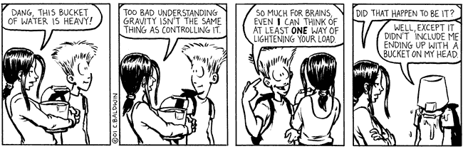 11/19 - This week i have no really precise new plan. i did want to introduce at least one hobby/activity. So on Tuesday I'll have her playing soccer. I have a good plan for another hobby, but I haven't been able to write it pleasably yet. Monday's strip just tickles me. For no good reason. Something about Jim's last line. It's a stupid strip, but i can't help myself. |