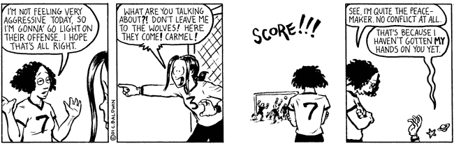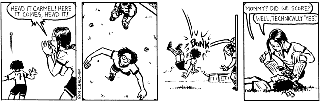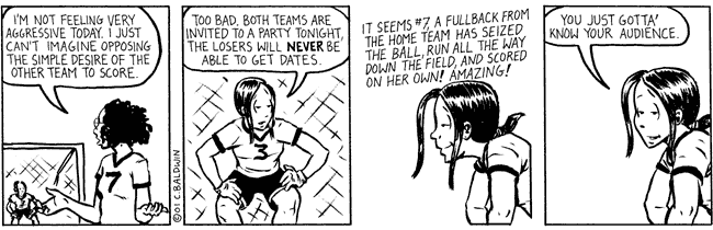 | 11/20 - Today's strip feels right on, but at the same time, it is out of time. I couldn't run today's strip until it was already established that they play soccer, since no ball nor very many signs are shown that indicate that soccer is what they are playing. |