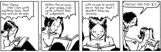 11/21 - Todays' strip has ups and downs. i think it's charming, and amusing. but i find the text she's writing in her diary so terribly trite that it's painful, and her shock is simply too predictable, too over-the-top. It's still charming.