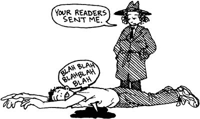 2/12/02 - Well, I just heard back from Lee Salem from Universal Syndicate regarding "Madge's Diary", and I'm afraid the first letter was a form-letter rejection. Mr. Salem is the editor I've recieved the least communication from in the past, which means that I expected it to make the least amount of impression on him now. So the first disappointment isn't as bad as it could have been. Anyhow, it's linked off the main "Madge" page, or directly here.