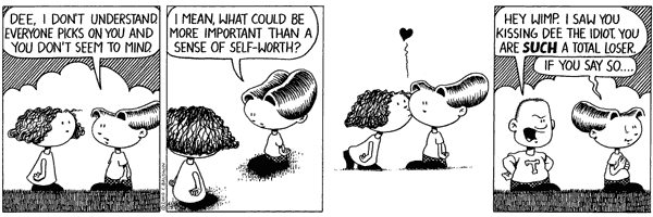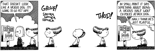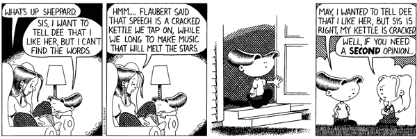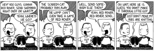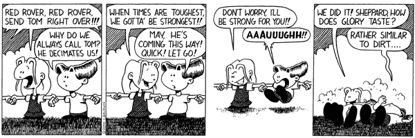 Chris orchestrates the strip:Well, I know that I lived, alongside multiple physical incarnations of May, in a muddled state inside Chris's head for years; but the last three months were the most cruel. Essentially an acknowledgement that until that point he had not taken us seriously, and now he only did so for his own personal gain. Not only his personal gain but out of envy and lust for the success of friend of his who finally made it into the syndicated land.During those days of development, he worked us hard. He inked me so many different ways, he changed the shape of my head, one moment round, the next oval, the next lumpy. Now I admit that most cartoons would be envious of so much attention, and would feel that I'm a bastard (well, I am; Chris did no co-create me with any women, let alone one he was married to) for not appreciating that, but I've long since realized what his attentions mean. For "real" women, his attention means nothing but lust. One of these days I am going to get access to his private sketchbook and show you what I mean by that. For men it means competition. And for cartoons, it means authority, power, and ego. So okay, here's an example of needless crap he put me through. He needed a good "bit". You know, something that will appear occasionally in the strip as a running gag symbolizing some greater idea. Charlie got psychiatric help from Lucy, Calvin made maimed and horrified snowmen, Cathy said "ack" over seeing her body in swimsuits, and me? Something psychological and productive? No, he gave me red-rover. Red rover red rover, lets cause Sheppard huge amounts of pain. He justified it as showing the contrast of my personality to May's. How I was apprehensive, weak, a submissive little runt of a child. The only thing I can rationalize out of this inflicted cruelty is that he foresaw my current rebellion, and he thought he would try to control it when he was firmly holding the reins. But frankly, I don't think him bright enough for such foresight.