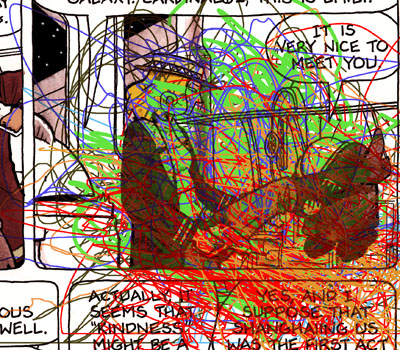 An earlier version, with coloring assistance by Miles, Age 4 (not my nephew). Despite the Pollockian flair, editorial sent it back for revision.