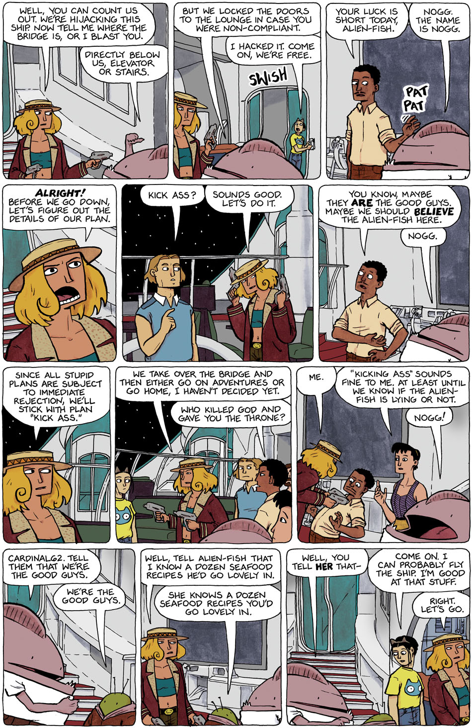 Tamfang March 28, 2011 at 11:06 am 15 years ago In yester-strip, Nogg clearly said “the galaxy”, so there’s no intergalactic anything yet. Perhaps you meant interstellar. (Can you tell this is a pet peeve? One occasionally hears smirking so-called journalists describe low Earth orbit as “intergalactic”.)