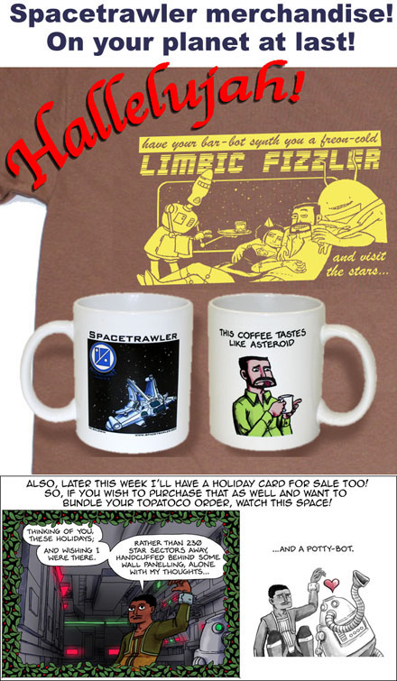 Umm… so that’s the big news of the day. Spacetrawler Merchandise! And so here’s your chance to buy, blog, link, and generally lose your mind raving about it. 🙂