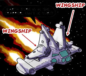 9. @Chris: I actually did think about what the ship looked like. But the fact is, the only protuberances we’ve eve seen doing anything are those of the spacetrawler (panel 8). We’ve never seen any guns. We have, however, seen that ships can stay docked at the bottom, quietly out of sight, so why not a third wingship? (save for the obvious misnomer it would be)