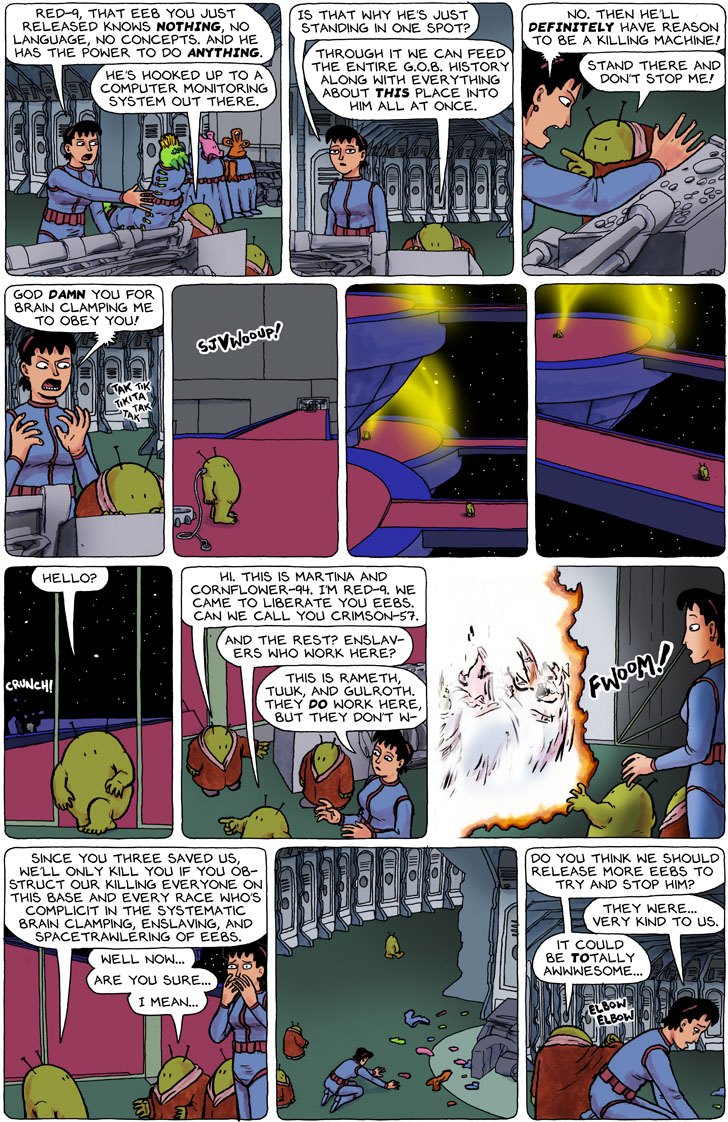 This strip shows the incredible necessity of good editing. And no, I’m not talking about all the nit-picking details that others have pointed out so far. (Although, while we’re picking nits, should Red-9’s statement in panel 9 [Can we call you Crimson-57.] be a query instead?)