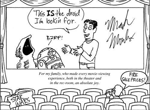 Also got to talk a bit with Mark Monlux, a local toonsmith, who does the webcomic “The Comic Critic.” His comic reviews films, and when you buy a book, he asks you what film you’d like to be in and then he draws you in it. I was VERY tired, and so “Star Wars” was all that came to mind. All fine and good. And then I read his little extra blurb, and once my mind caught up with the joke, I had a good laugh.