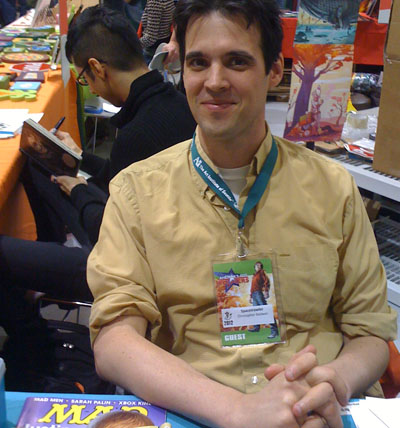 Had a fun time this weekend at the Emerald City Comic Con (even being WAY over-tired on Sunday). So many people to link to, so I’ll just highlight a few (I did just create a long list of quick links, and then in tiredness, lost them). I was sitting as ever with TopatoCo (thank you guys, so awesome!) between the very talented Jhonen Vasquez of “Johnny the Homicidal Maniac” and “Invader Zim” (pic above, sitting behind me) and Tyson Hesse of “Boxer Hockey” (which I’ve been so meaning to read, and so we traded books, and it is great) (pic of his comic below).