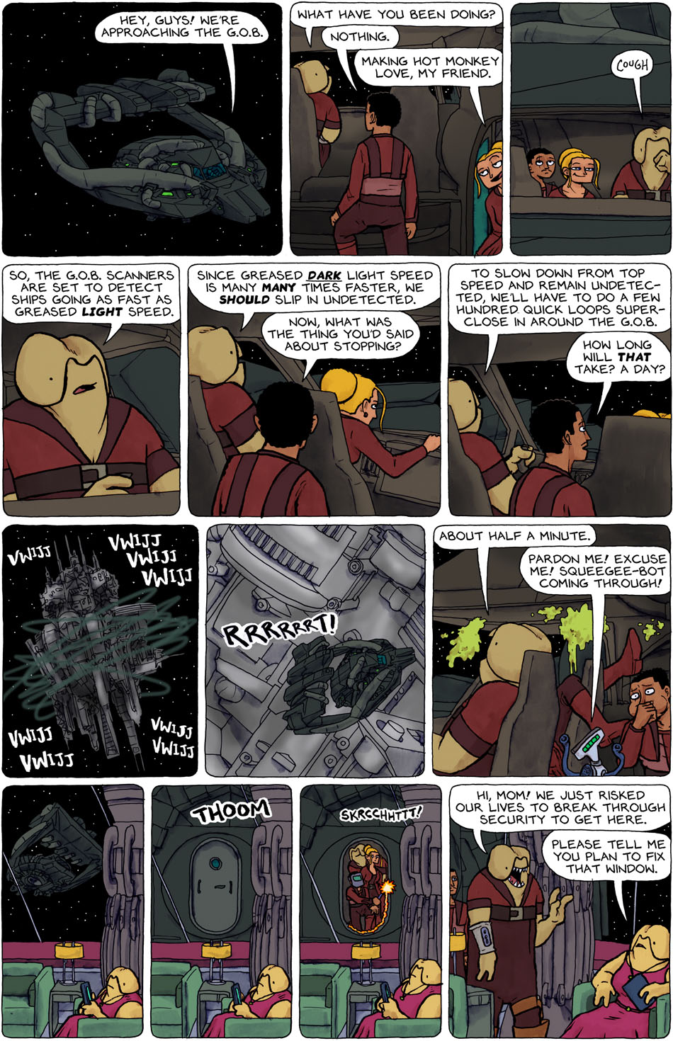 Heh, for like a quarter second there my brain started to spin up into physics mode wondering why angular momentum was different from linear momentum in relation to whatever tech allows them to drop from near-luminal velocity so fast (i.e. why they got dizzy/sick). Then I remembered that would be pointless since the tech in question is undefined…