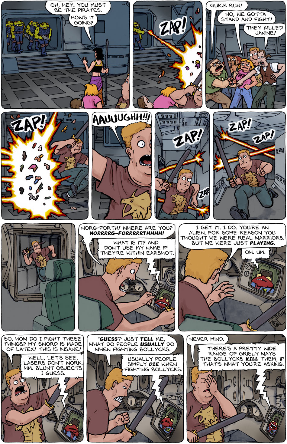 As for the poor larper … “come get me out of here right now or I be using your name really loud over the intercom REALLY soon!” of course then he’s gonna realize that if he doesn’t do in the Bollycks then he’s a liability to Norg … so hang up and sic’em on Norg when he comes trying to keep him quiet and use the diversion to escape?
