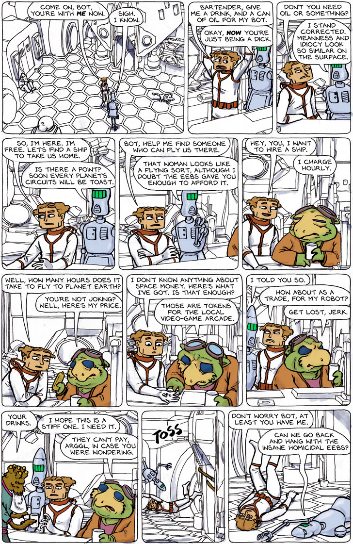 I don’t know. I kinda like the all white backgrounds. Gives the strip a real alien feel, you know? Who’s to say there isn’t an all white bar on a planet somewhere as the alien artwork lies entirely outside what humans consider the visible spectrum.
