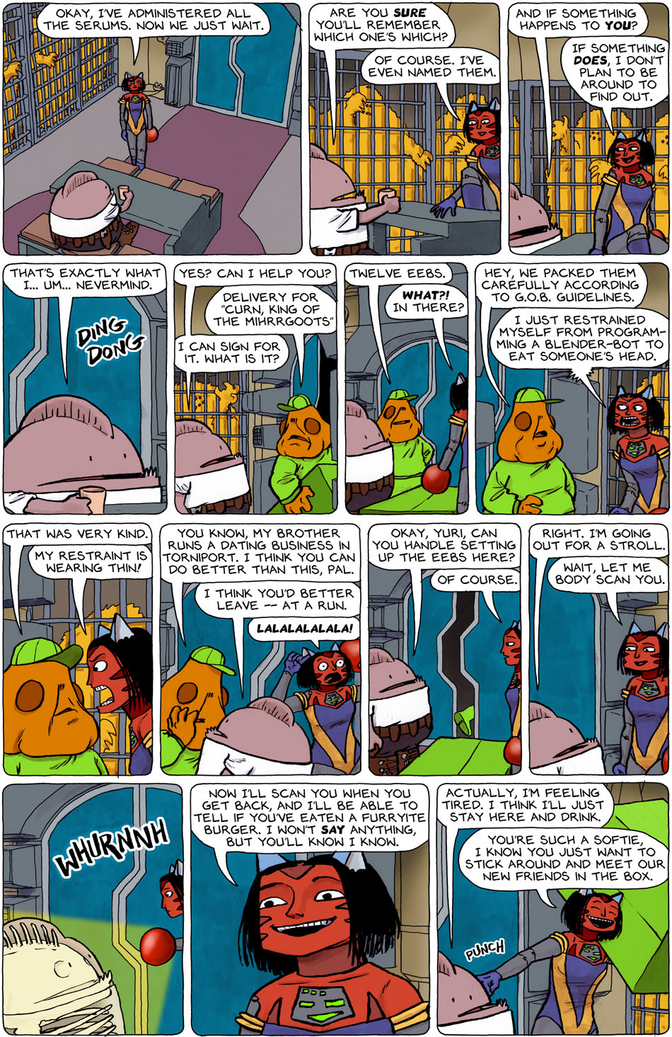 I thought for a second that Yuri’s chestplate was mimicing her facial expression, like Zeetha from Girl Genius’ headband does. Actually, Zeetha is an expie of Phil Foglio’s old Xxxenophile character Black Opal, who had a clasp that did the same thing.