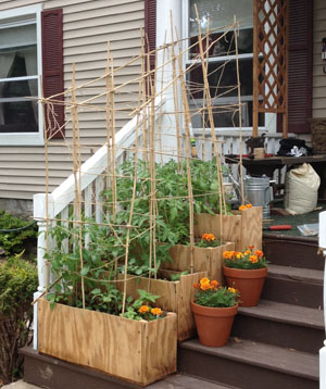 Remember those tomato boxes I built? Well, those tomatoes are doing well, and today my girlfriend and I put together a bamboo-and-twine structure to support the tomatoes. Quirky and I love it.