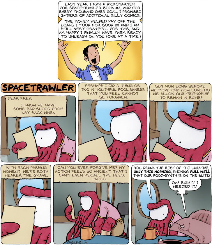 Ok I’m confused .. is Nogg saying the things in the last panel in shock like he forgot? Or are we to believe Nogg in his old age has gone completely mental and is now cared for by Krep? That my friend is mental. But ok I going to think Nogg has lost his mind and Krep is caring for him and now this note that Nogg wrote long ago on paper when Nogg could still tie his shoes is going to be used as toliet paper? If you are truly sorry or want to give a meaningful thing you write the note on paper. And there aren’t a lot of planets that make paper anymore unless it’s religious. The religious paper is the same color as the note Krep is reading. You see Nogg is just an ass and is trying to get Krep to let him wipe his butt because of the food? Hell no make the butt wiper thing break then Nogg will need to wipe .. what does food do with any of this?