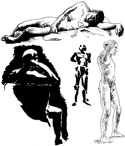 John Hampshire, who runs the drop-in modeling class al the local community college was on sabbatical last semester, and so Tuesday night was the first model-drawing studio I’ve done since December. Was totally psyched. It’s been so long, I just wanted to play around with various ways of inking, and form and shadow. A little rusty, but I’m pleased with the result.