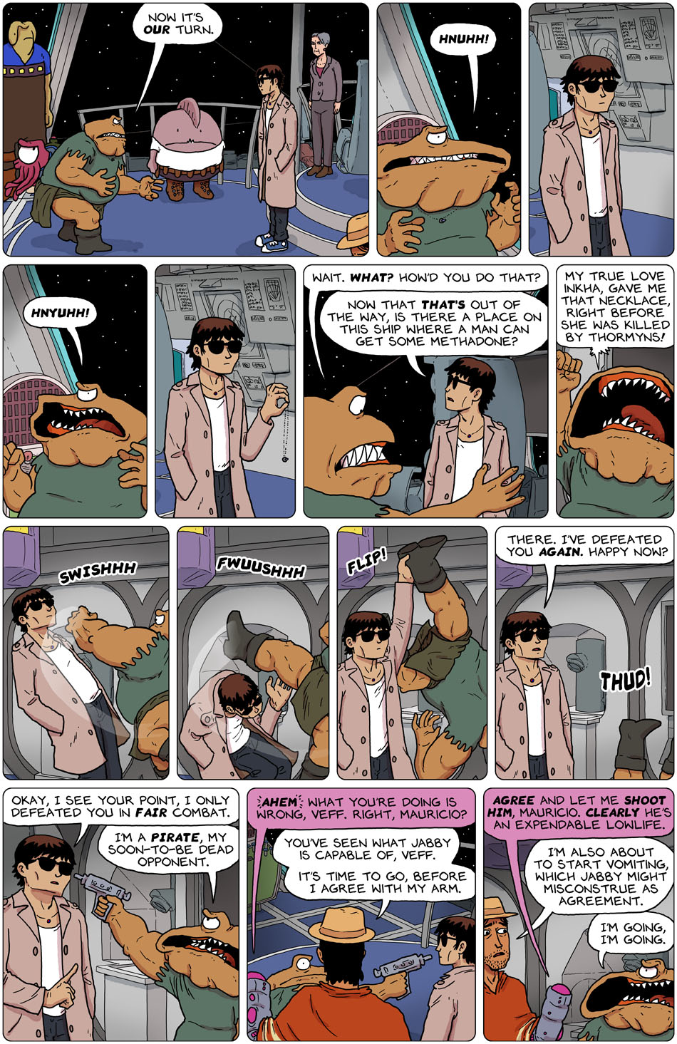 And Hwan definitely IS smooth. I double-checked to see if he employed a classic magician trick, to use a diversion (Bikkie’s fight) to do the deed ahead of time, but no. Panel 2 shows the pendant, panel 4 shows it is gone.