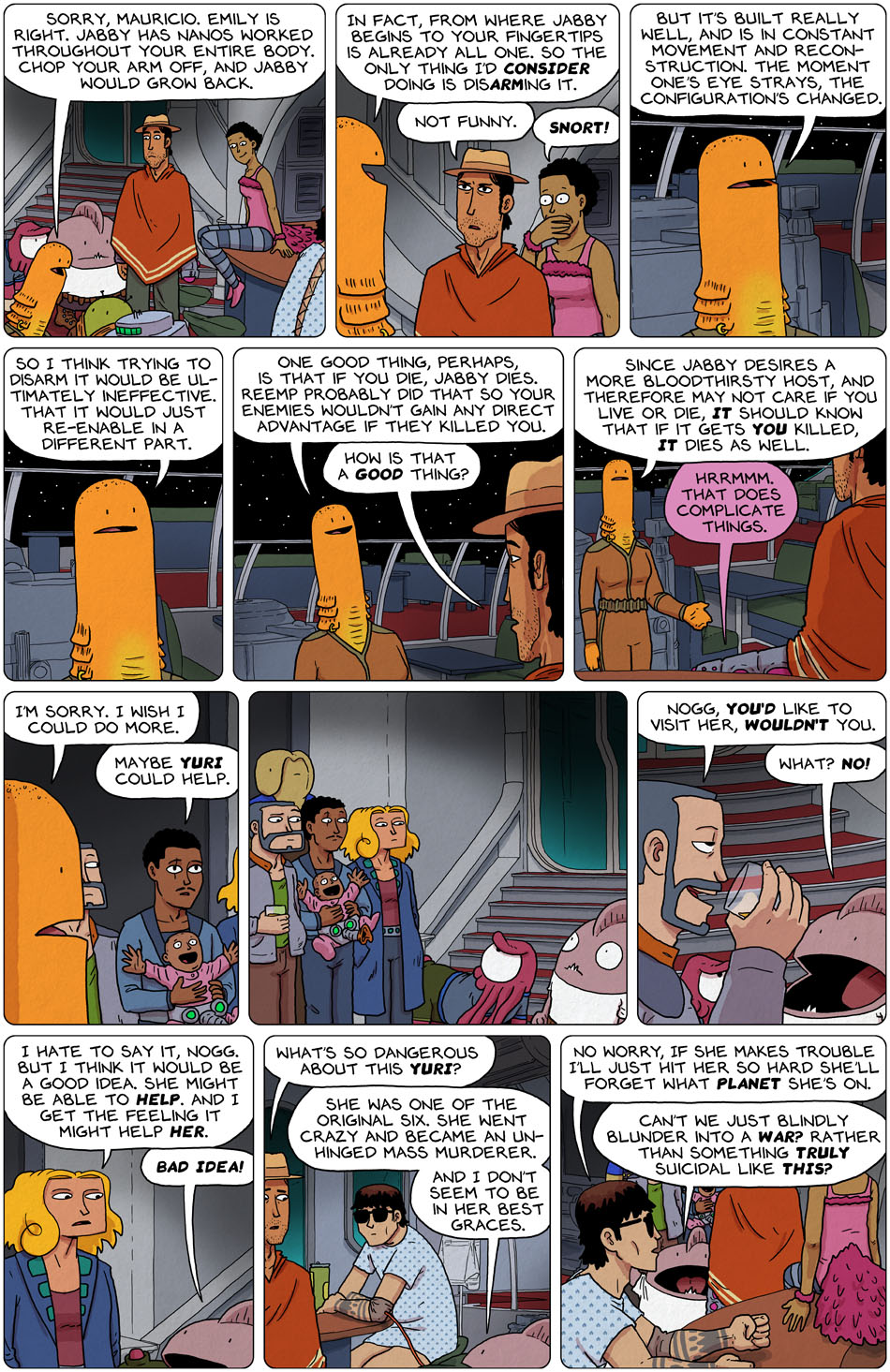 It is impressive to me the amount of personality that is conveyed in every panel. Each of the various crew members and even some of the other people who show up in the strip are distinct. Even though it is a series of 2D still frames, I am getting a some of how each being might move in real life.