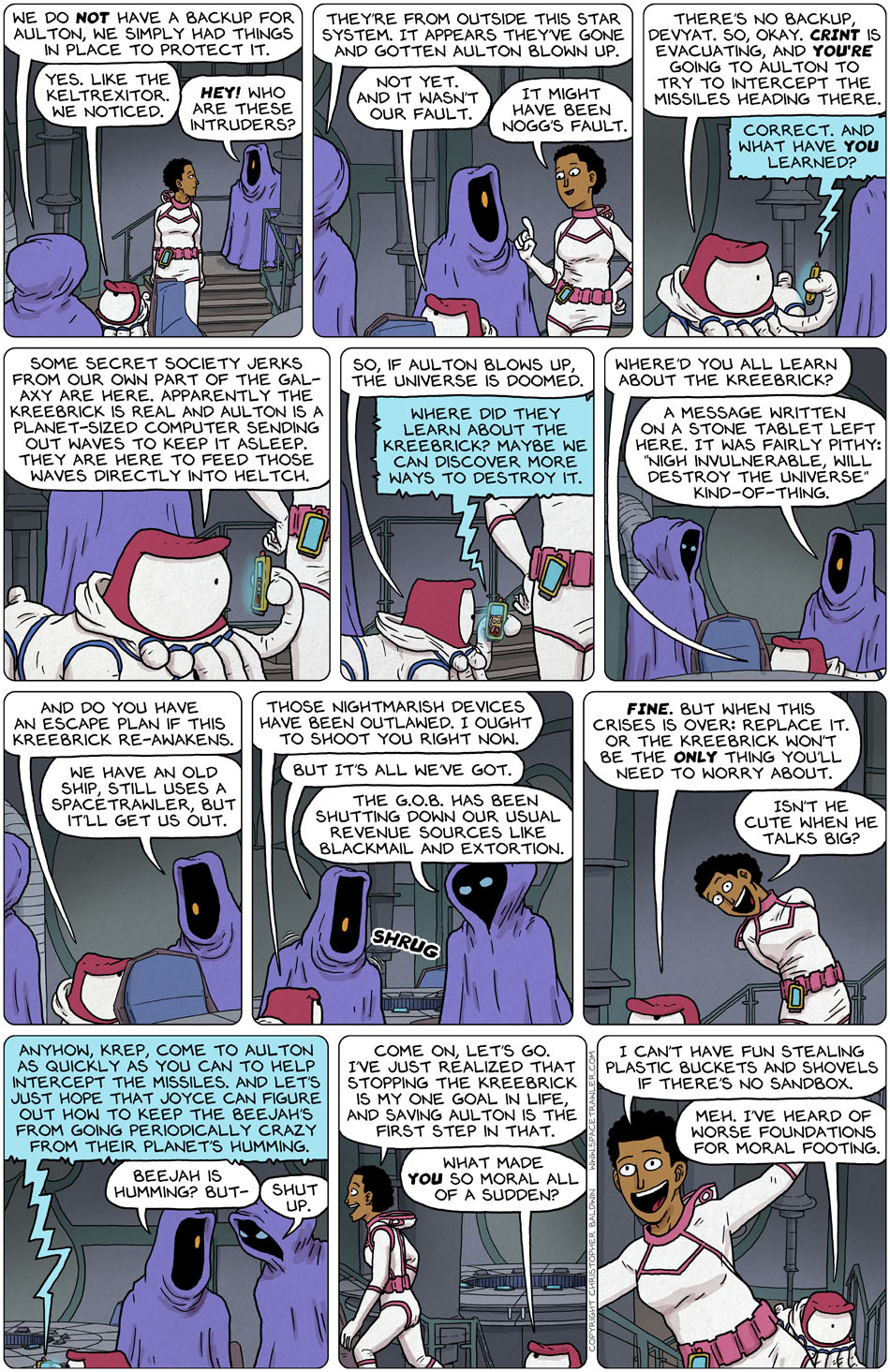 Your Spacetrawler and Dave Kellett’s Drive (which he maddeningly updates only once a week) are the only sci-fi Web comics that have consistently held my attention and that I *always* follow and reread. The fact that your story has so many twists and turns, the characters are so compelling and your artwork is superb AND coloured puts it top – which is saying something as I LOVE Drive! I hope the story you have planned for Spacetrawler goes on for a very long time. I don’t want it to end.