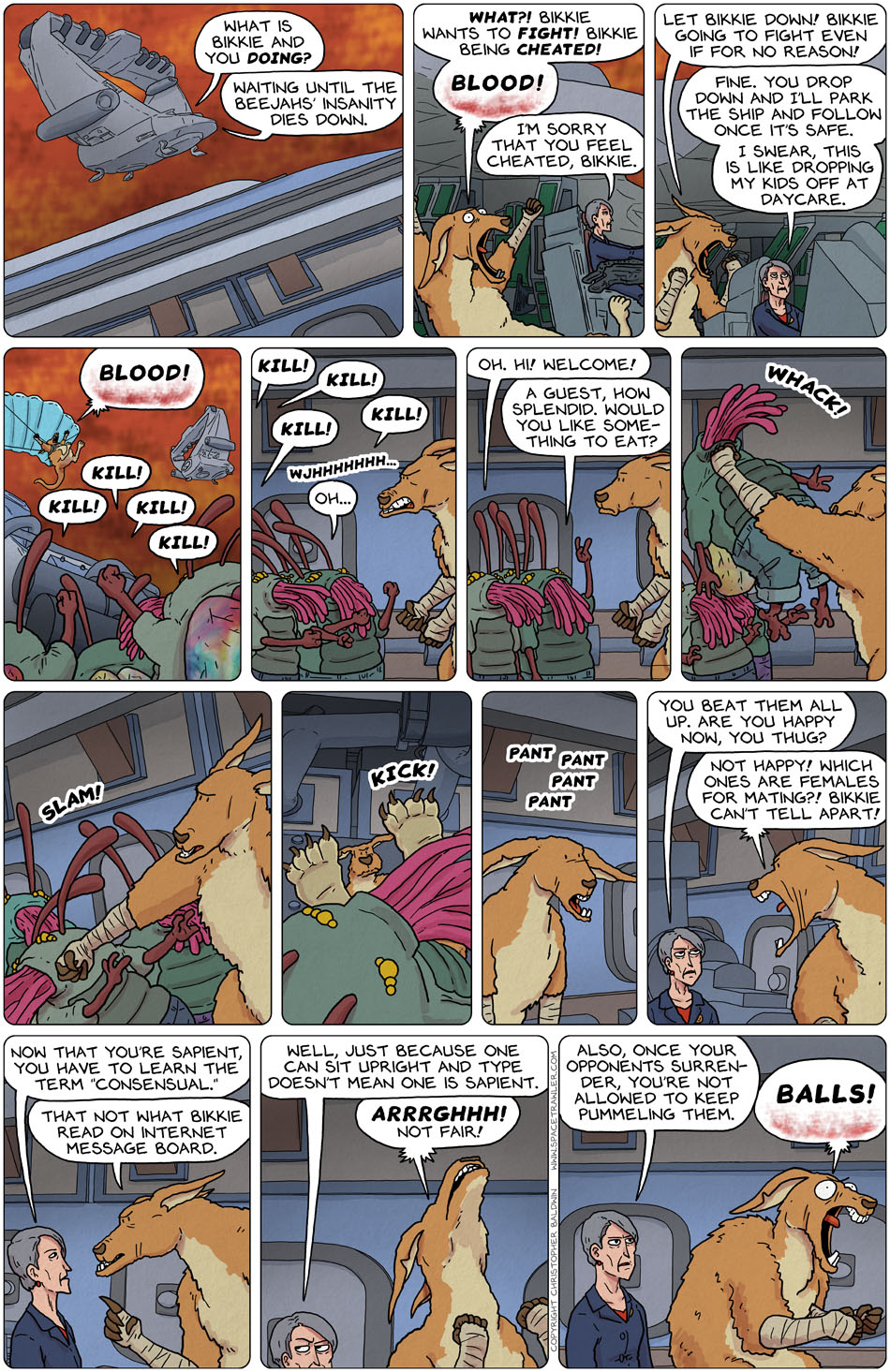 One of the pleasures in reading Spacetrawler is scrutinizing your artwork, Chris. I haven’t mentioned the Beejahs’ clothing before but those fat semi-insect bodies stuffed into short dungeree pants with rolled up cuffs always makes me chuckle. I echo Gurf’s sentiments ‘they’re cute’ even when they’re yelling “Kill!”