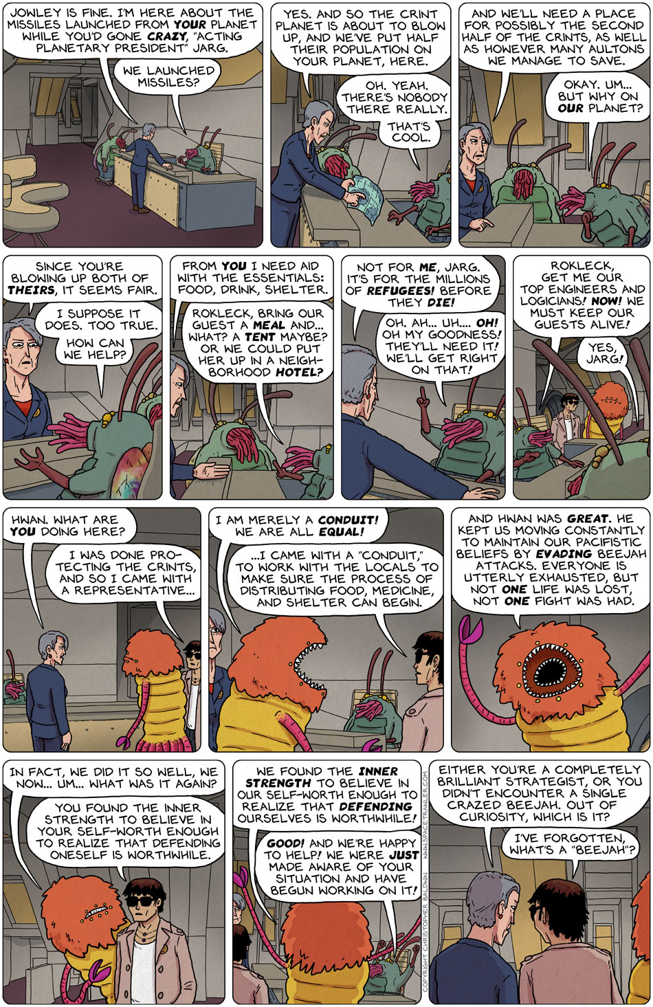 07/24/17 Aid to Refugees Previous | Next 1st Series | 2nd Series | 3rd Series | First Strip Current Series | Archive | Most Recent Previous | Next 1st Series | 2nd Series | 3rd Series | First Strip Current Series | Archive | Most Recent Phew! Settled in in Vermont. Have begun back tot he grindstone. Starting with today’s strip! First Strip First Series | First Strip Second Series | First Strip Current Series| Archive | Most Recent 07/19/17 Bikkie Won’t be Cheated 07/26/17 Unexpected Aulton 5 Comments Coyoty July 24, 2017 at 2:21 am 8 years ago It could be both. Hwan could have brilliantly avoided the Beejahs if Joyce hadn’t switched off the machine making them crazy. Yarrun July 24, 2017 at 9:55 am 8 years ago If Hwan doesn’t end up being some sort of secret mastermind, I’m gonna eat my hat. Or, presuming I don’t have a hat on me, everyone else’s hat. Muzhik July 24, 2017 at 6:20 pm 8 years ago Yarrun, do wigs count? How about toupees? Night-Gaunt49 July 24, 2017 at 8:40 pm 8 years ago Could Hwan be a hidden Chess Master in all this? Or so cool he fools everyone? Peter Rogan July 24, 2017 at 11:34 pm 8 years ago Hwan: Master of Mystery. How does he do it? Usually, he doesn’t. He just stays out of sight and out of harm’s reach. Simple path to success, really. Leave a Reply to Yarrun Cancel reply Your email address will not be published. Required fields are marked *CommentName* Email* Website Notify me of follow-up comments by email. Notify me of new posts by email.
