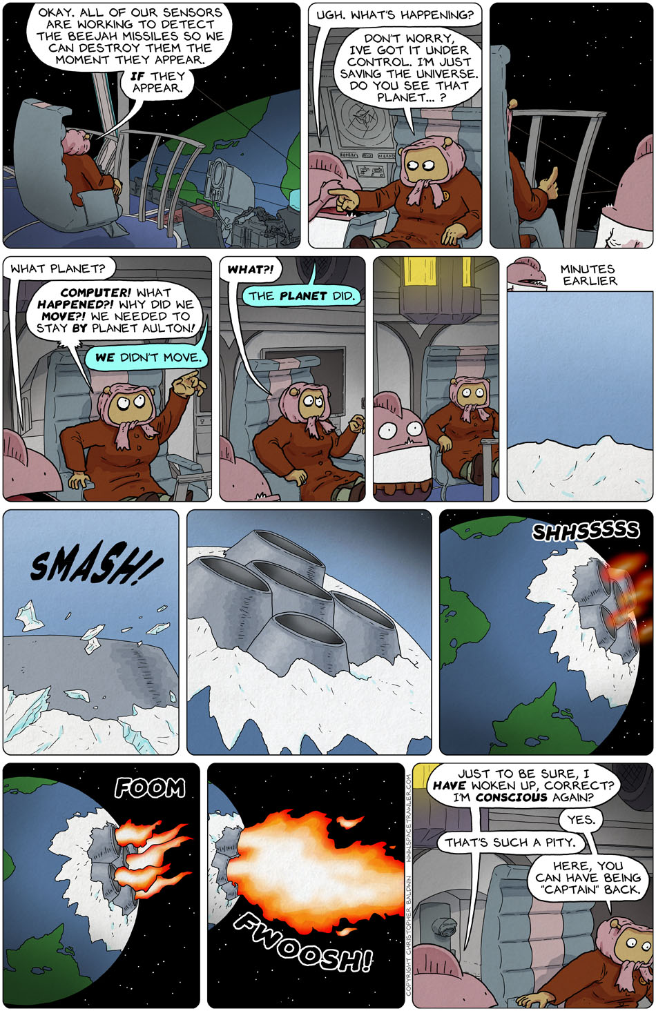 THAT’S IT! If I cared at all about the physics in this comic before, I’ve officially stopped as of now. What’s the reaction mass? The planet’s core? WHO CARES!!