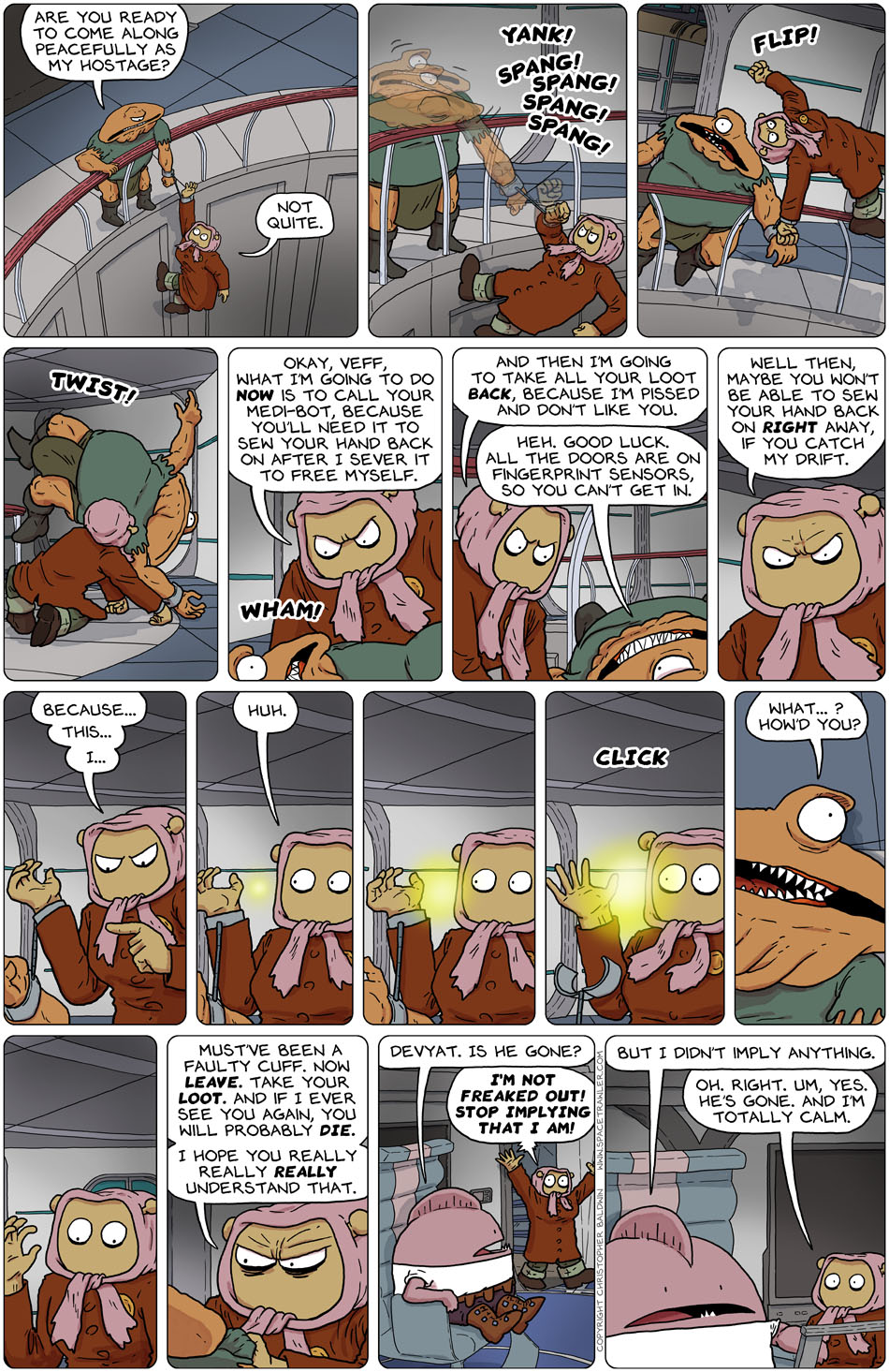 I’m on the side of “not Eeb telekinesis” because of the way that sequence is drawn. Devyat is clearly surprised by something, and there is a definite visible manifestation of some kind in the space between her face and the handcuff. Unfortunately my brain is not working well enough right now to formulate a theory as to what actually happened, so I’m just going to enjoy the reveal in its own good time.