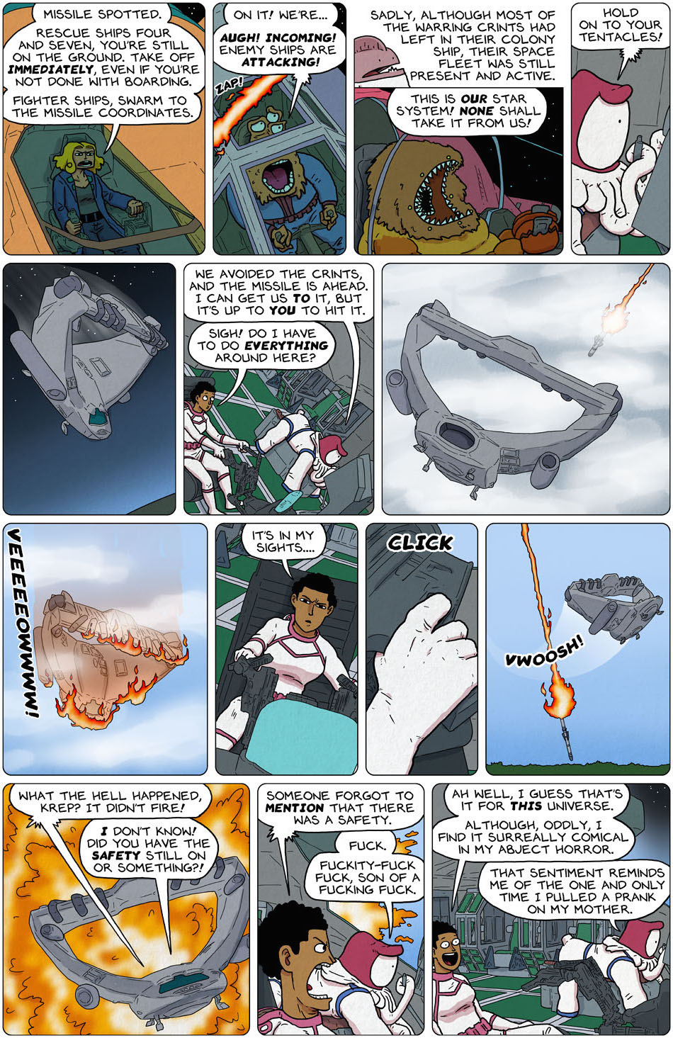 Weird. Before I read your short comments after the strip, I thought “The best laid plans of aliens and men oft go astray” (just a little different from what you wrote). Hm, wonder if Bikkie could’ve kicked that missile into another universe?