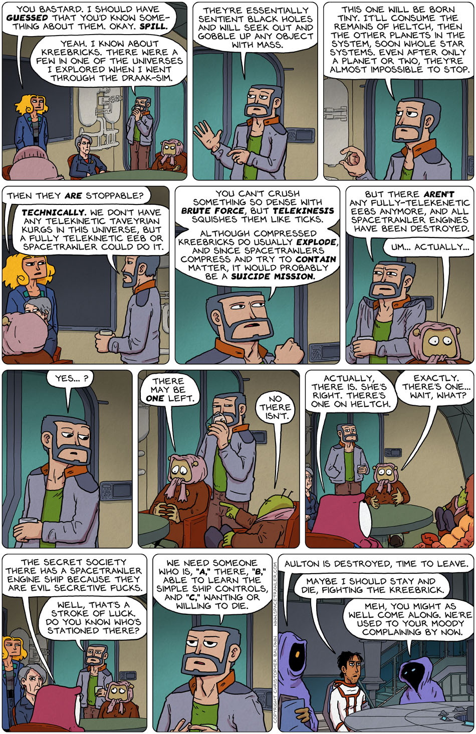 Hah! Called it. But, “a few?” Dimitri has dealt with “multiple” Kreebricks? In “one of” the universes he explored? Alright Chris, when this story is done, you totally need to do a separate comic detailing Dimitri’s adventures through the Draak-Sim, because it’s sounding like the journey he went through was…you know, just a little bit awesome.