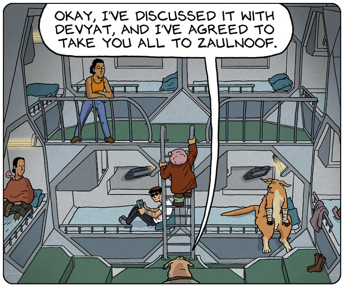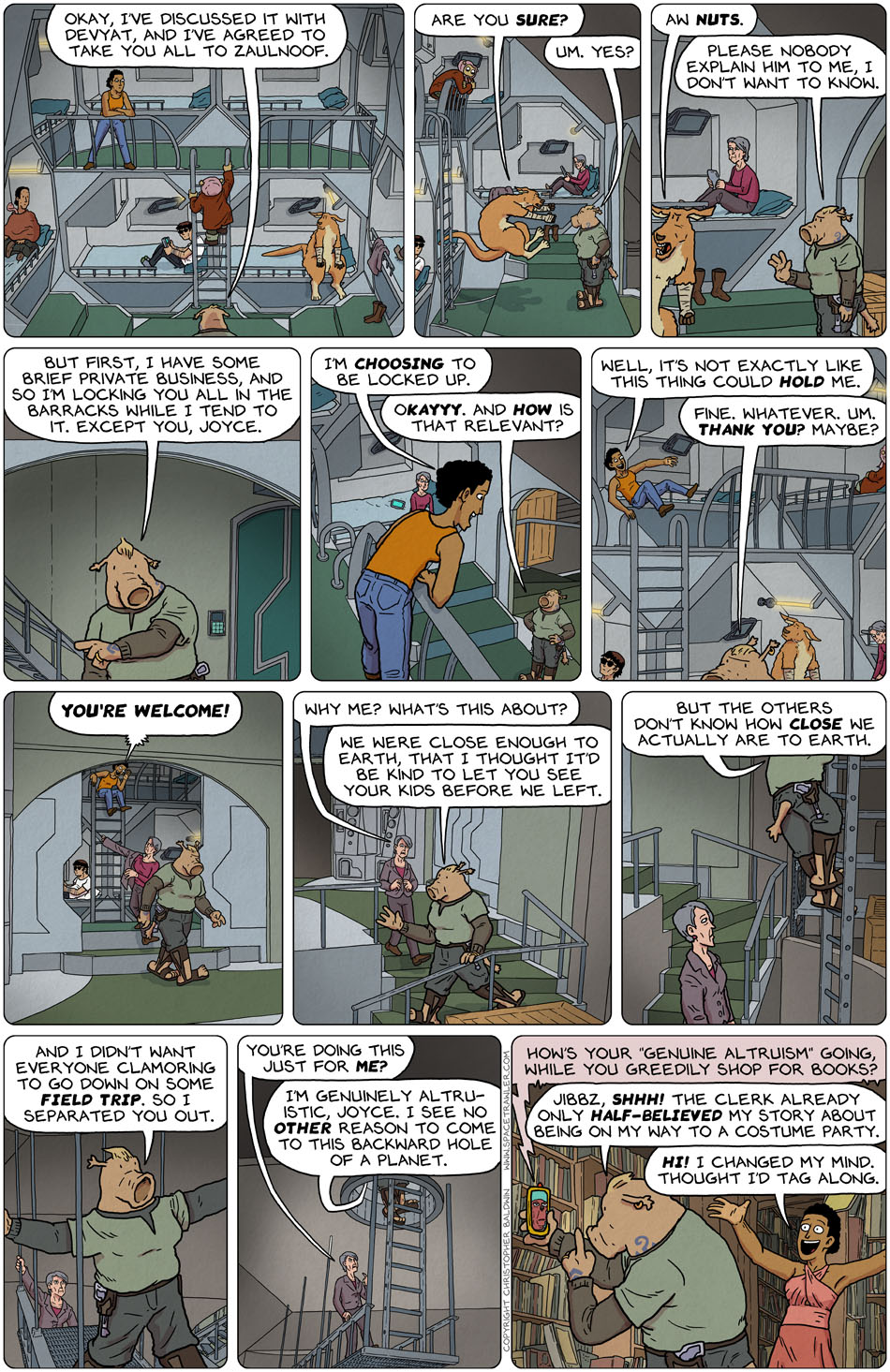 I like the perspective of the ship, Chris. Took me a minute to figure out the 2 dark objects above Hwan’s and Bikkie’s head were vid screens until I moved to the next panels. I really enjoy scrutinizing your drawings almost as much as I do reading the story. It’s nice to have both good art and a good story together. Few webcomics do that.