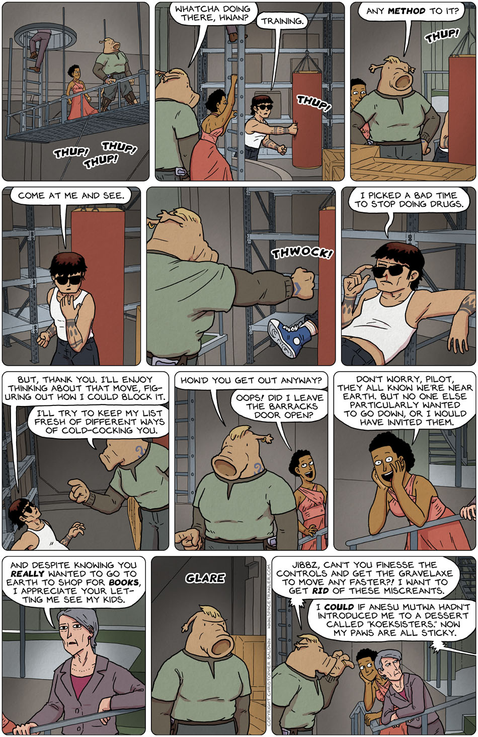 Being not from Amerca, I never heard of you until I accidentally stumbled upon Spacetrawler the other week. It’s both lucky and a shame: A shame that I didn’t know about you before as your awesome story and excellent art sucked me in like Kreebrick, lucky as I now have a fairly large archive to read through and won’t have to wait for updates :3
