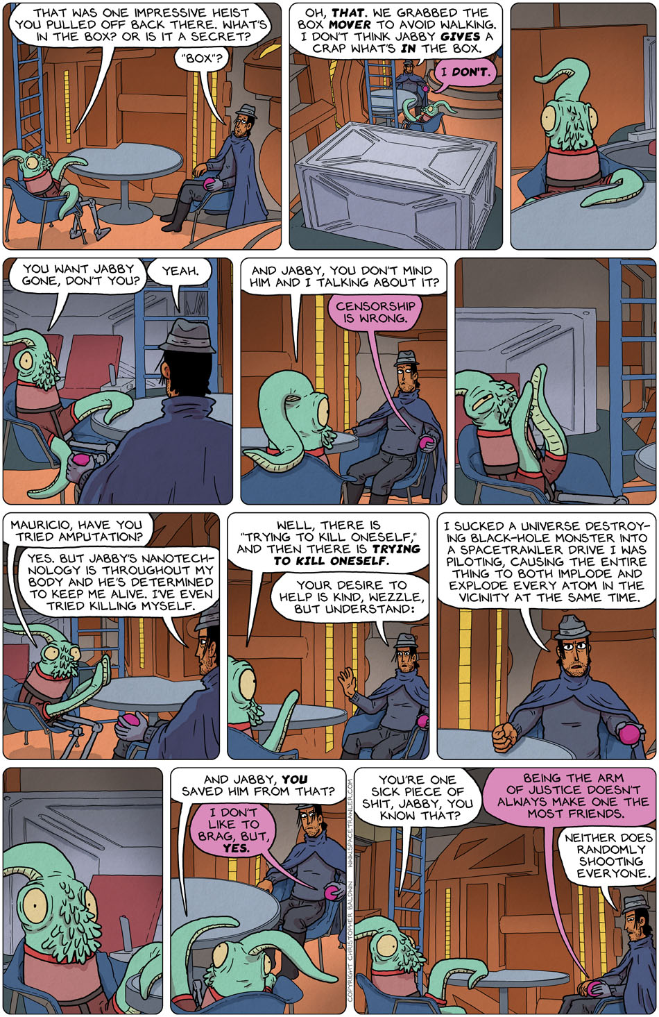 Which suggests an even more unpleasant result. If Jabby can survive such an implosion/explosion, what’s to keep him from doing the same to the entire universe when he knows he and his concept of ‘justice’ will be the only things left? Mauricio not included; his value even as transport and life-support seems to be compromised, if not already demonstrated disposable.