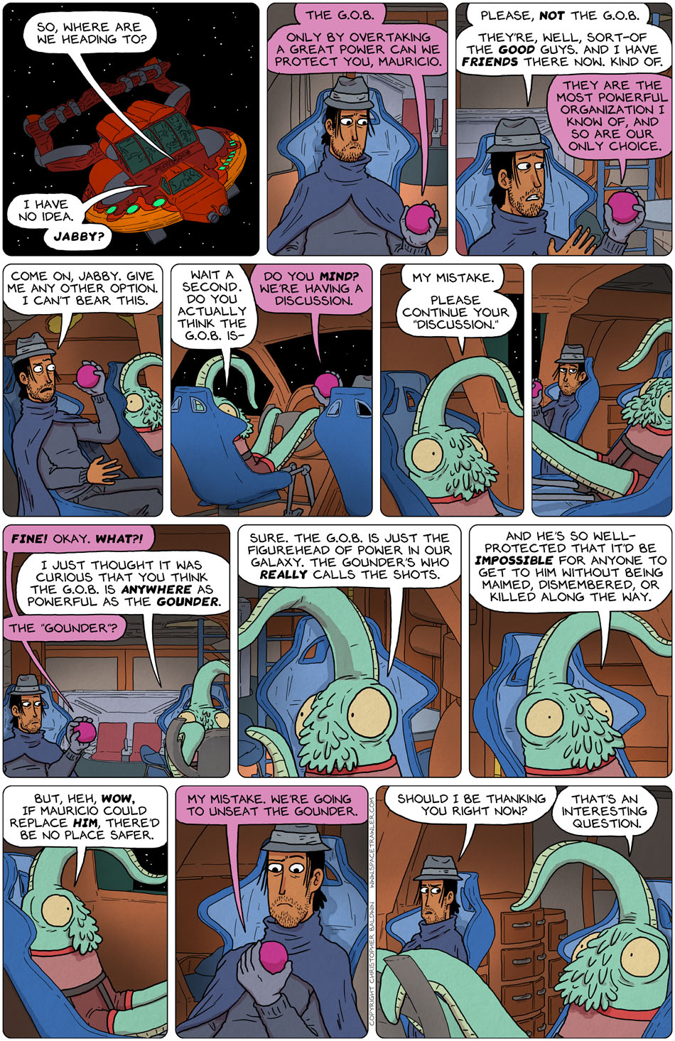 Makes me wonder what Wezzle knows about this ‘Gounder’ he isn’t telling right now. He’s only said enough to divert Jabby to a new target. Whether it’s for personal gain, or personal animus, or some altruist shtick he’s shown he’s capable of, we won’t know until the confrontation. By which time Wezzle will have figured out how to be two steps ahead of Jabby than one.