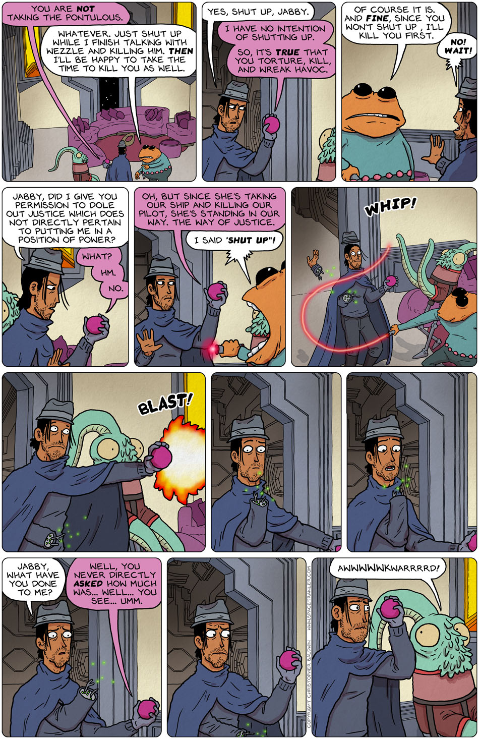 Such a character Wezzle is! Wasn’t afraid to push it with Jabby and then, despite Klypt’s sadistic cruelty, Wezzle wasn’t afraid to insult her (though I had trouble thinking of Klypt as female). With those eyes of his, it’s impossible to judge whether events shocks and horrifies him or if he’s instead, totally nonchalant. However he feels, I’m not sure if having Wezzle on your side is a good thing or if it’s better to be as many lightyears as possible away from him. You’re stuck with him now, Mauricio, as long as Jabby’s part of you and useful to Wezzle.
