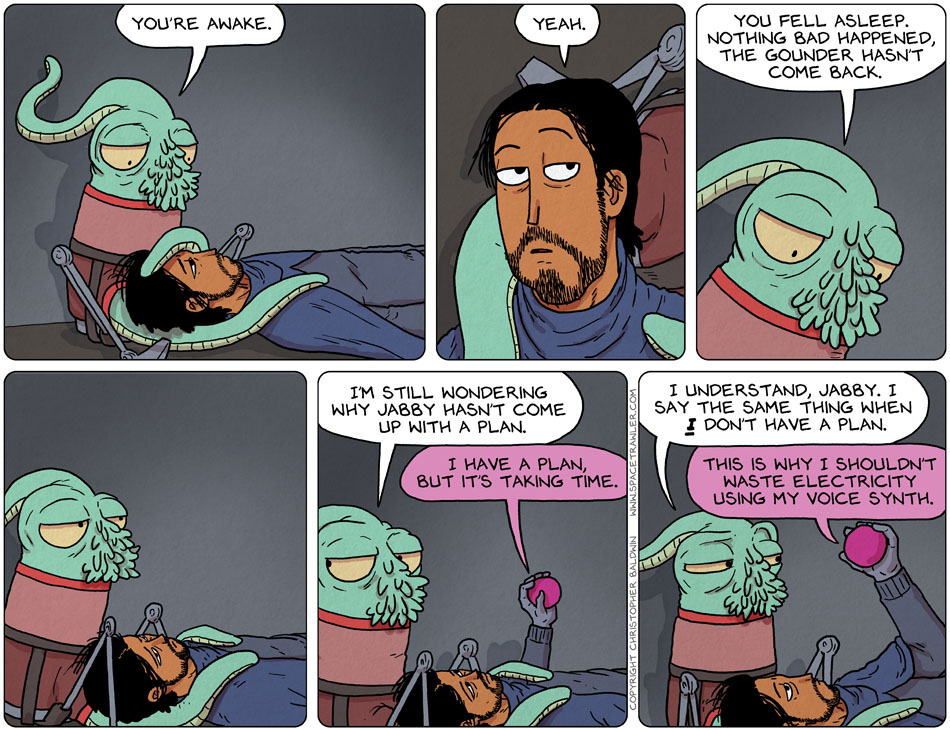 I am very much enjoying this worthy successor to the original run, and also happy that you’ve gone for more frequent updates of Spacetrawler. I heartily approve of your plans.