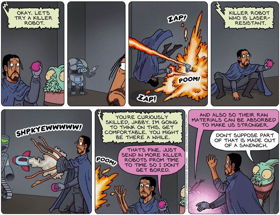 So what’s at the top of this pit? Because at first everyone seemed to act like it was open, but I find it hard to believe Jabby couldn’t fly out or climb out somehow. Is the Gounder talking to them over an intercom or just standing at the top of the pit or what? Can Jabby produce autonomous drones or is he required to remain one single coherent unit?