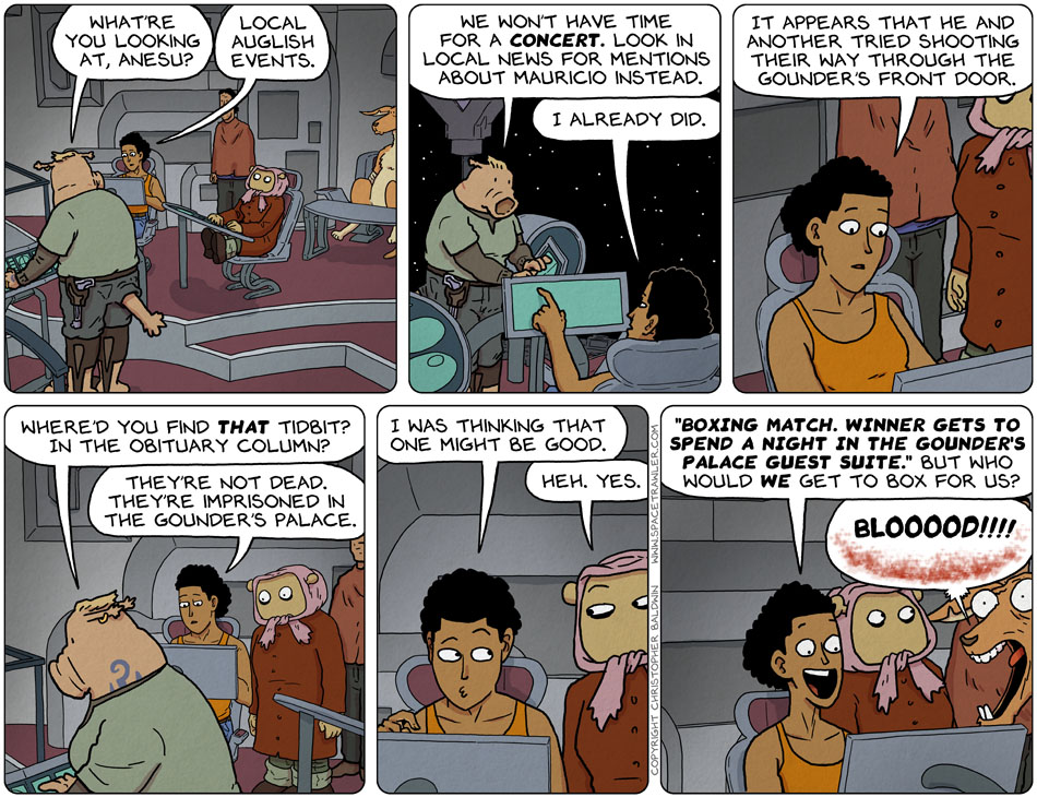 05/02/18 – Local Auglish Events Previous | Next 1st Series | 2nd Series | 3rd Series | First Strip Current Series | Archive | Most Recent Previous | Next 1st Series | 2nd Series | 3rd Series | First Strip Current Series | Archive | Most Recent It’s like me checking out Facebook for an area before visiting. With less obituaries or blood. First Strip First Series | First Strip Second Series | First Strip Current Series| Archive | Most Recent 05/01/18 – Killer Robots 05/03/18 – Deciding Who Boxes 10 Comments MikeyLikesIt May 2, 2018 at 12:11 am 8 years ago So cold-blooded to take advantage of your gullible fellow Earth creatures like that! Mic May 2, 2018 at 12:18 am 8 years ago But the Gounder’s not from Ear-ohhhhhh. Leinglo May 2, 2018 at 12:45 am 8 years ago Oh, this is gonna be fun, we get to see Khorne’s own marsupial champion in action again. PeterK May 2, 2018 at 1:36 am 8 years ago BIKKIE IS READY Felix May 16, 2018 at 1:16 pm 8 years ago BLOOOOD! caribouchat May 2, 2018 at 3:13 am 8 years ago I’m so grateful for the four weekly laughs you give us. I love your new updating schedule. Coyoty May 2, 2018 at 4:32 am 8 years ago It must be nicer than the guest pit. Kaidah May 2, 2018 at 8:14 am 8 years ago The guest suite comes with a bed and only half as many killer robots. Knicholas May 2, 2018 at 10:12 am 8 years ago Bikkie. Bikkie!! BIKKIEBIKKIEBIKKIE!!! Ahem. Bikkie is easily my favourite character. Peter Rogan May 2, 2018 at 1:09 pm 8 years ago ….I feel a strange disturbance in the Force. As if millions of red corpuscles cried out in terror and were silenced. I must sit down a while. You, you go on with your practicing. Leave a Reply Cancel reply Your email address will not be published. Required fields are marked *CommentName* Email* Website Notify me of follow-up comments by email. Notify me of new posts by email.