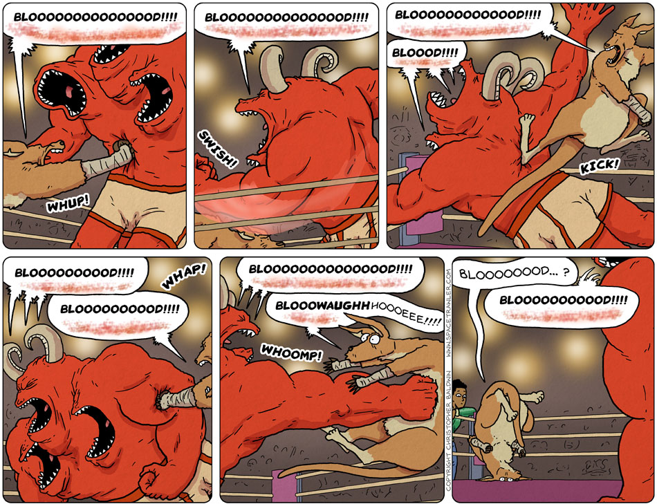 Poor Bikkie. I had no idea that monster was SO much larger than Bikkie. Devyat, get busy and equalize this fight. We can’t let some boorish monstrosity who can’t keep any of his three mouths shut to best our hero!
