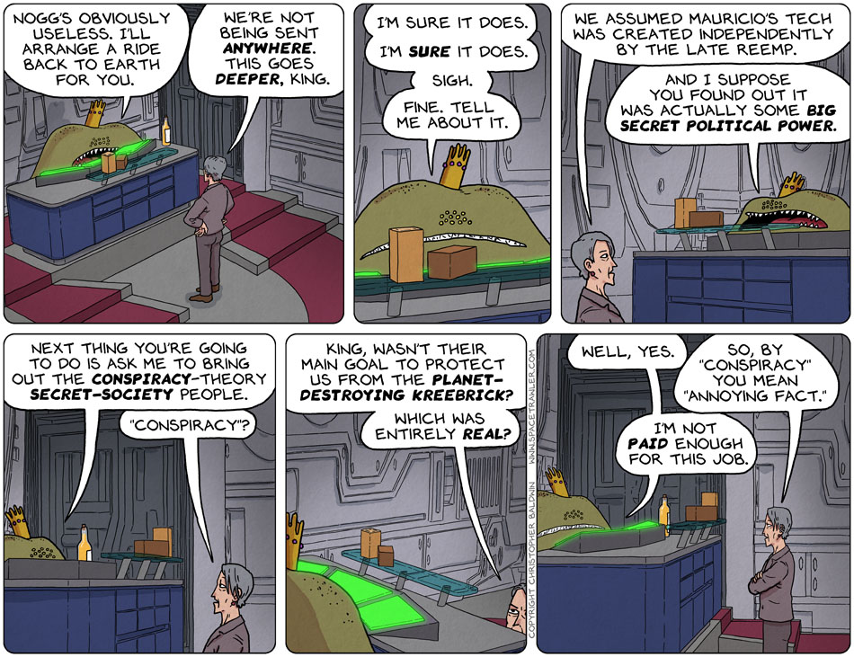 The boxes on King’s desk moved, and switched order. Their positions in panels 1 to 3 are the reverse of 4 to 6. There must be something conspiratorial about this. Chris denies there’s anything wrong on the Patreon page. I think he’s in on it.